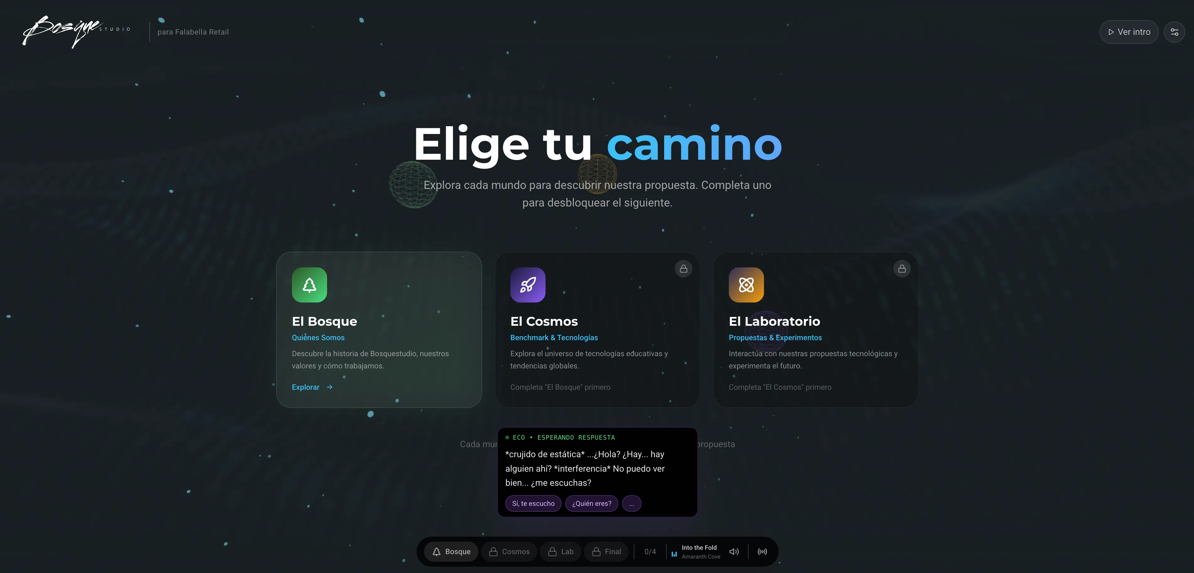 La demo es una experiencia web interactiva que se siente más a un videojuego que a una capacitación. Se personaliza con el nombre y género de quien participa, tiene personajes ficticios que acompañan el recorrido completo, y está dividida en tres capítulos: quiénes somos, un benchmark de tendencias globales en aprendizaje corporativo, y cómo esas tendencias se aplican en onboarding real. Fondos 3D, música sincronizada, desafíos interactivos, y distintos finales según cómo cada persona resuelve los retos.