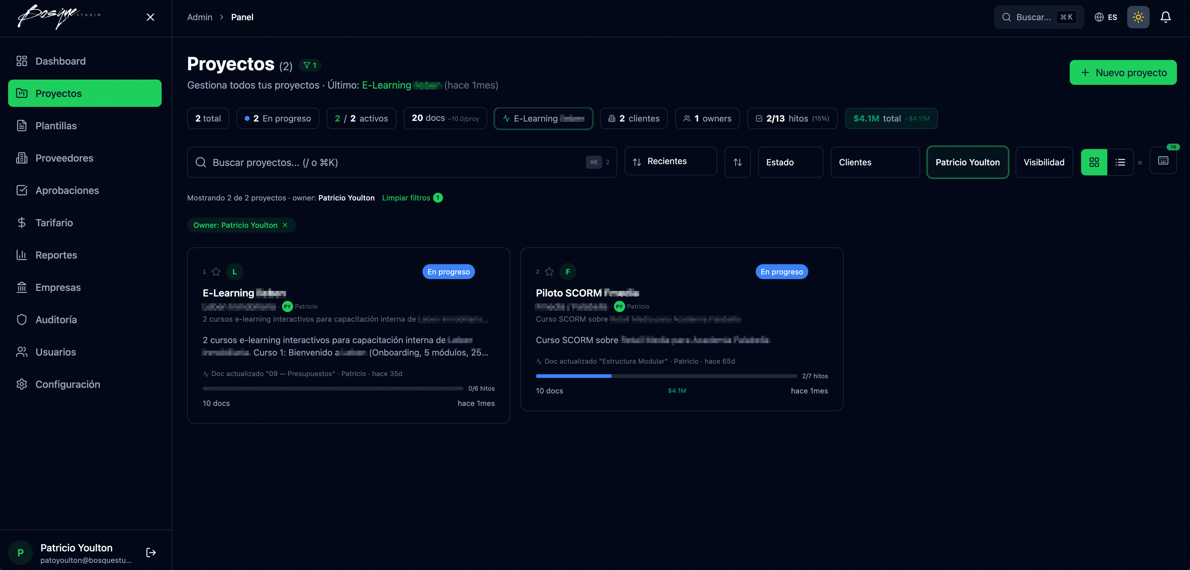 El Admin Proyectos Academia es una plataforma multi-cliente sobre Node.js, React y PostgreSQL. 29 rutas de API, portal cliente con flujo de revisión guiado y aprobaciones con firma, sistema de presupuestos y cotizaciones, documentos versionados, 9 templates de email, soporte en tres idiomas, y más de 150 componentes de interfaz.