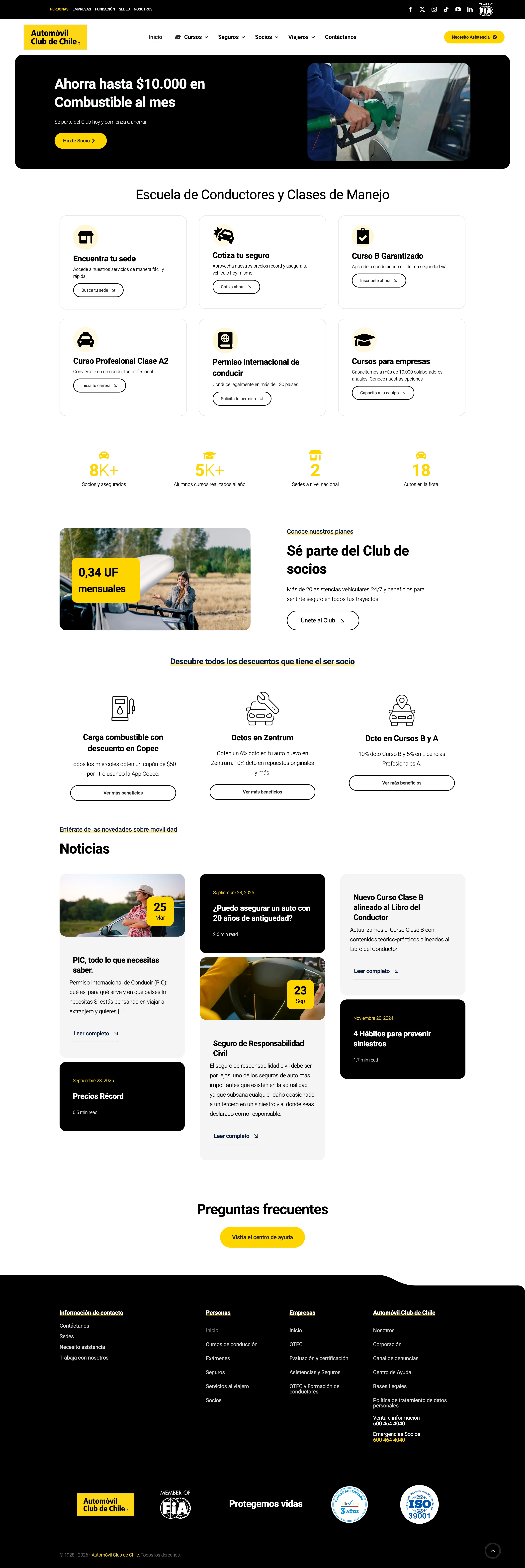 El Automóvil Club de Chile opera desde 1928 y tiene dos públicos completamente distintos: personas que buscan cursos de conducción, seguros y asistencia en ruta; y empresas que necesitan capacitación OTEC, evaluación de conductores y servicios corporativos. El sitio necesitaba servir a ambos sin confundirlos.